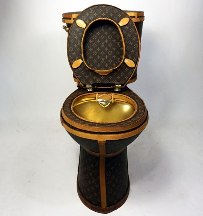 民间艺术家 Illma Gore 将24枚价值15000美刀的 Louis Vuitton 包袋彻底肢解,将皮革包裹在马桶上,里面还镀了金,售价100000美刀!!!好吧,现在连shi都拉不起了。