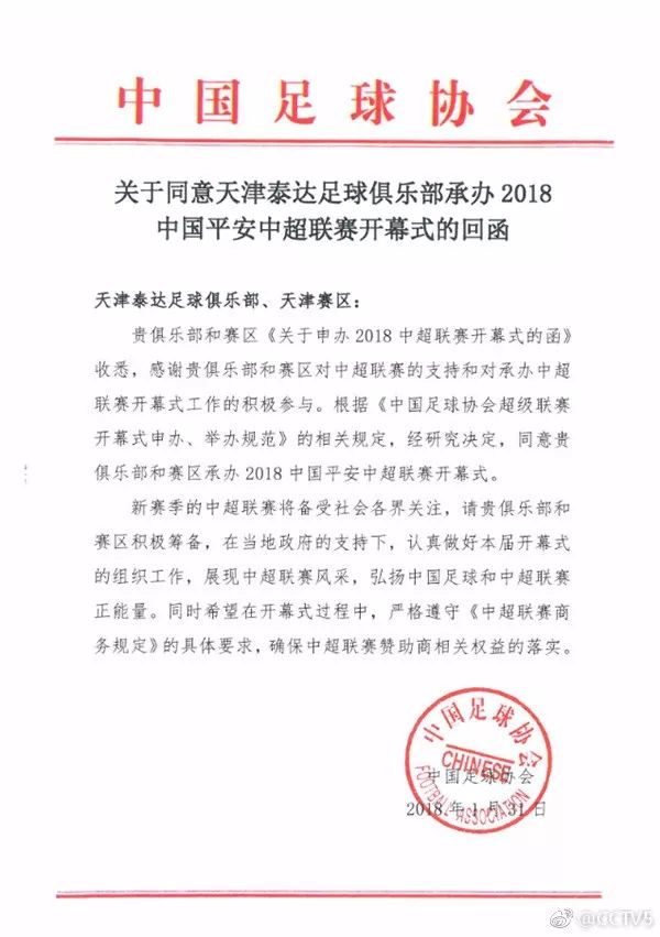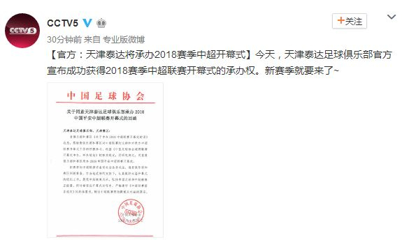 今晚读丨天津泰达将承办2018赛季中超开幕式