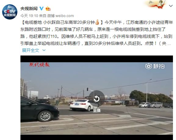 【电缆垂地 小伙踩自己车高举20多分钟】今天中午,江苏南通的小许途经青年东路附近路口时,见前面堵了好几辆车,原来是一根电缆线脱垂到地上挡住了路,他赶紧拨打110。因维修人员不能马上赶到,小许将车停到电缆线底下,站到引擎盖上举起电缆线让车辆通行,直到20多分钟后维修人员赶到。点赞!