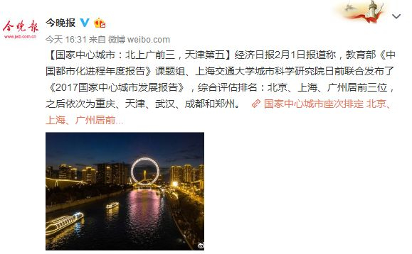 【国家中心城市:北上广前三,天津第五】经济日报2月1日报道称,教育部《中国都市化进程年度报告》课题组、上海交通大学城市科学研究院日前联合发布了《2017国家中心城市发展报告》,综合评估排名:北京、上海、广州居前三位,之后依次为重庆、天津、武汉、成都和郑州。