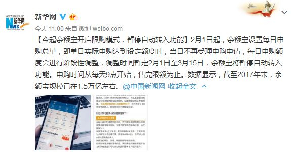 【今起余额宝开启限购模式,暂停自动转入功能】2月1日起,余额宝设置每日申购总量,即单日实际申购达到设定额度时,当日不再受理申购申请,每日申购额度会进行阶段性调整,调整时间暂定2月1日至3月15日,余额宝将暂停自动转入功能。申购时间从每天9点开始,售完限额为止。数据显示,截至2017年末,余额宝规模已在1.5万亿左右。