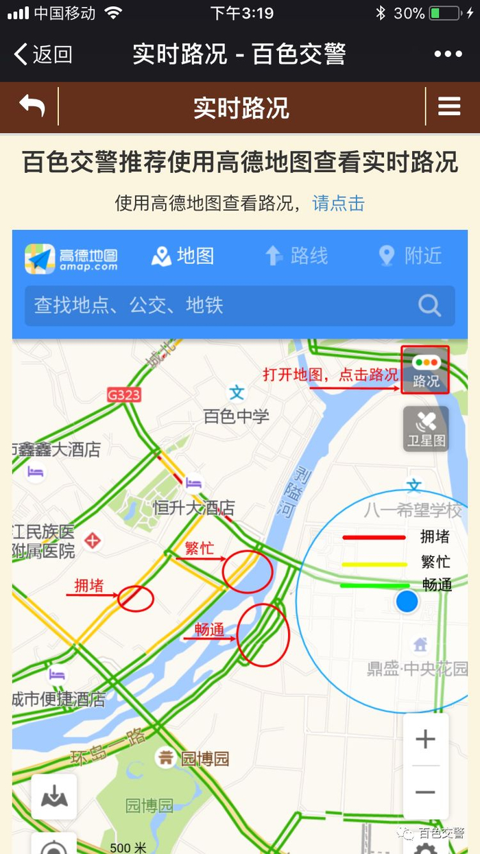 百色交警微信公众号有一个《便民服务》栏目,大家可以使用里面《实时路况》里的高德地图查看出行路况哦,从道路颜色,可以得知各路段通行情况,方便出行!