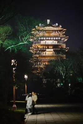 超然楼的灯光以暖黄色为主色调,从远处看光芒四射。
