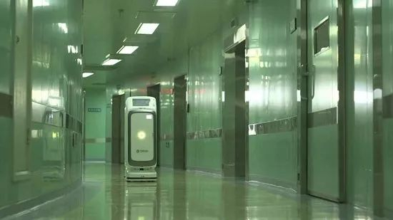 在川流不息的手术区走廊里,一个白色箱状机器正不疾不徐地来回穿梭。它熟练地拐弯,侧身避开障碍物,向着发出配送申请的手术室前进。