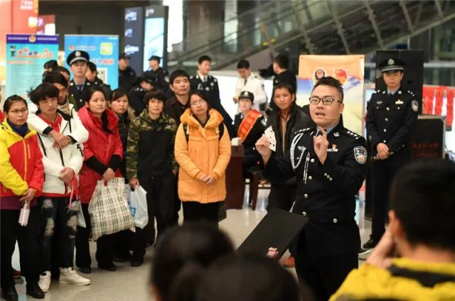 广西南宁火车东站,南宁铁路公安处民警在给旅客表演魔术宣传棋牌防骗知识。