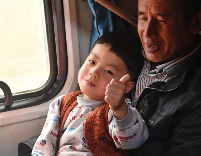 在从广州东开往达州的列车上,一名小朋友竖起大拇指。(来源:新华社)