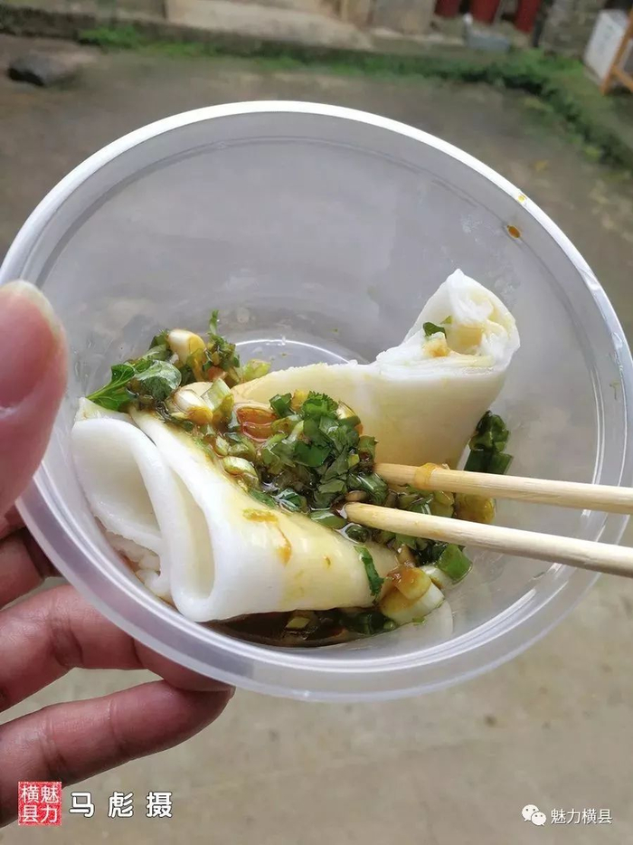 簸箕粉,是当地特色小吃。米浆摊在簸箕上变成一张均匀的薄饼,然后放进冒着热气的蒸锅里,只要一两分钟就蒸熟了,刚出锅的簸箕粉半透明状。