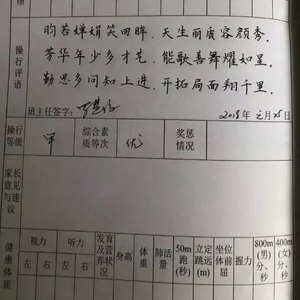 据@赣州发布 消息,赣州于都县天润学校六年级教师罗慧琼老师“诗性大发”用端正秀气的硬笔书法书写,将操行评语浓缩为精炼的七言诗句,并且诗句里还植入了孩子的名字。