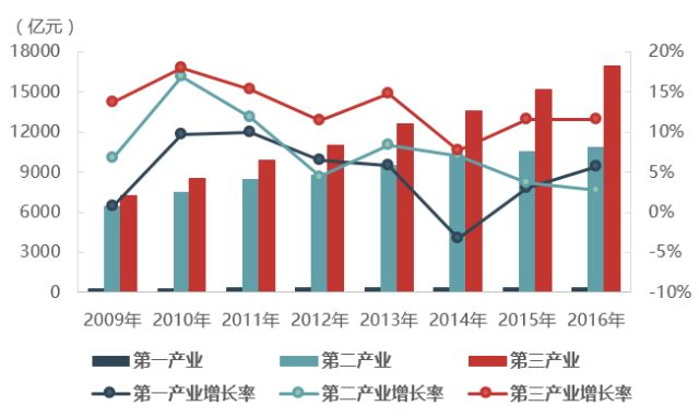 从产业生产总值分析,广佛同城化启动后,第一、第二和第三产业生产总值都有所增长,但增速明显不同,第三产业增幅高于第一、第二产业,第三产业占比从 2009年的 51.94%扩大到 2016年60.09%,增加近8个百分点;第三产业生产总值年均增长率达到12.89%。第二产业占比有所缩减,从 2009年的 46.13%缩减到 2016年 38.55%,缩减约 7.5个百分点,广佛地区产业转型升级效果明显。