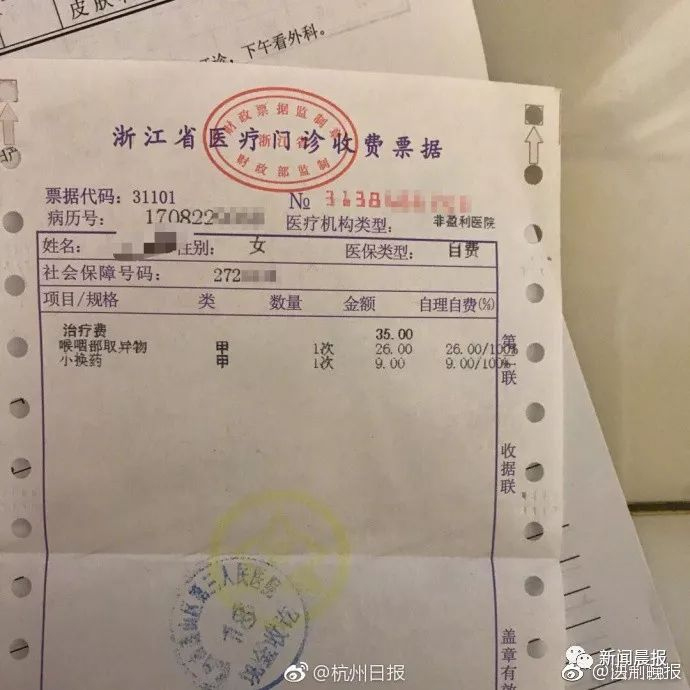 日前,有爆料者称,“今天中午跟朋友去吃烤鱼,结果不小心鱼刺卡喉,下午就去了萧山三院取鱼刺。就1分钟的时间,医生就取出一根1厘米左右的鱼刺。原以为拿个鱼刺最多也就10块钱吧,付款时居然收了35块!再算上挂号的10块钱,我也只是个学生,这么乱扣起来吃不消啊…”