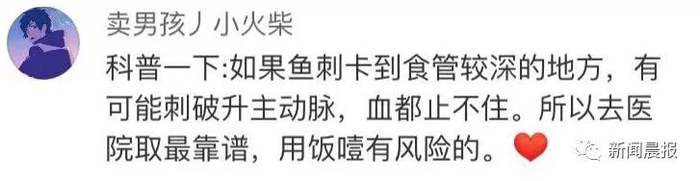 而吞米饭这种方式,同样不能解决鱼刺卡喉的问题,却容易让鱼刺划伤咽喉,引起发炎感染,甚至进入食道。
