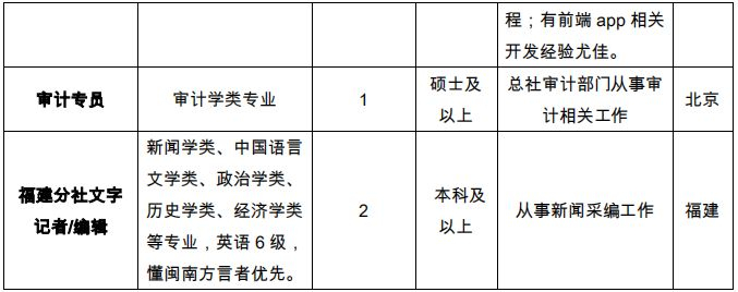 考生入职后,总社聘用人员享受国家事业单位人员待遇,为符合落户条件的大学生解决北京户口;福建分社聘用人员为合同制管理。