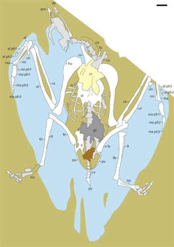 此外,这件标本明显缺失第I趾,是中生代鸟类中此项特征的首次报道。在与同样缺失第I趾的现生地栖鸟类进行对比后,研究人员认为尽管其前肢长度显示其可能具有较强的飞行能力,但古食种鸟仍然明显为一种地栖型的鸟类。