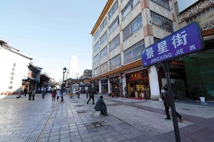 刚开街的景星街与以往相比,街道上行人不多,原本嘈杂喧闹的街道现在多了几分安静;一家民族饰品店的老板抬了把木椅子出来,坐在店门口晒太阳,多了几分惬意;临时摊位占道经营时,道路曾被占得只剩下1米多宽;如今道路宽阔了不少,原本被遮挡的两边老建筑重现,街道上偶见的一两块青石板能看出这里曾有的历史。