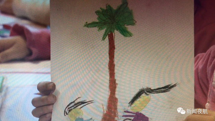 曾繁楷小朋友:我画的是椰子树,画的是大海,鲸鱼,这是太阳。
