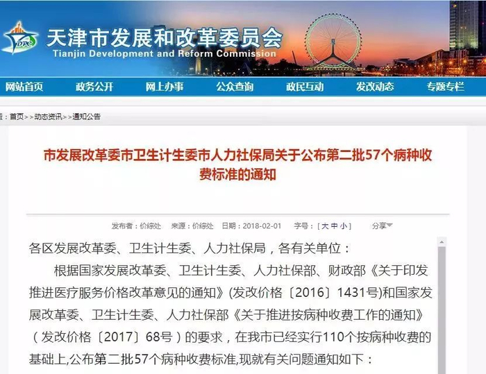 今年,按病种付费范围再次扩充。2月1日,天津市发改委网站公布了第二批57个病种收费标准。