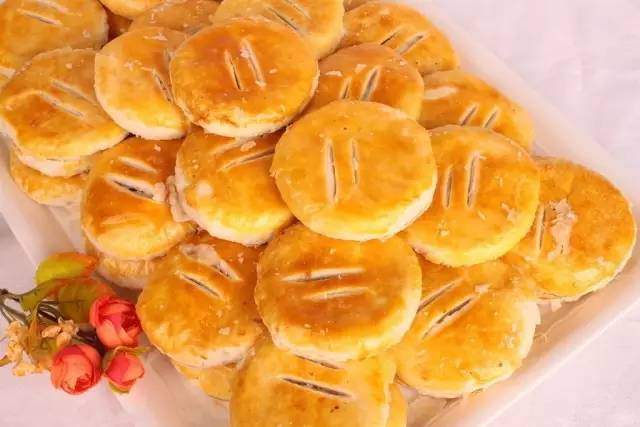 外皮烤成诱人的金黄色,里头一层层的油酥薄如棉纸,酥松得不得了,一咬下去碎屑便掉了满地。