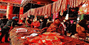 这里各种装饰用品应有尽有,灯笼、中国结、对联、年画、门笺、吉祥物等摆放错落有致,每一个店铺都被喜庆的红色浸染。