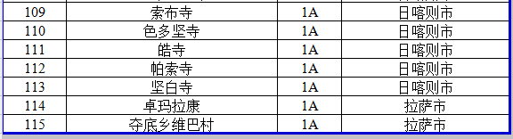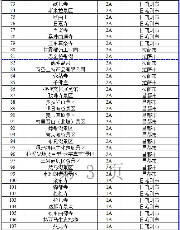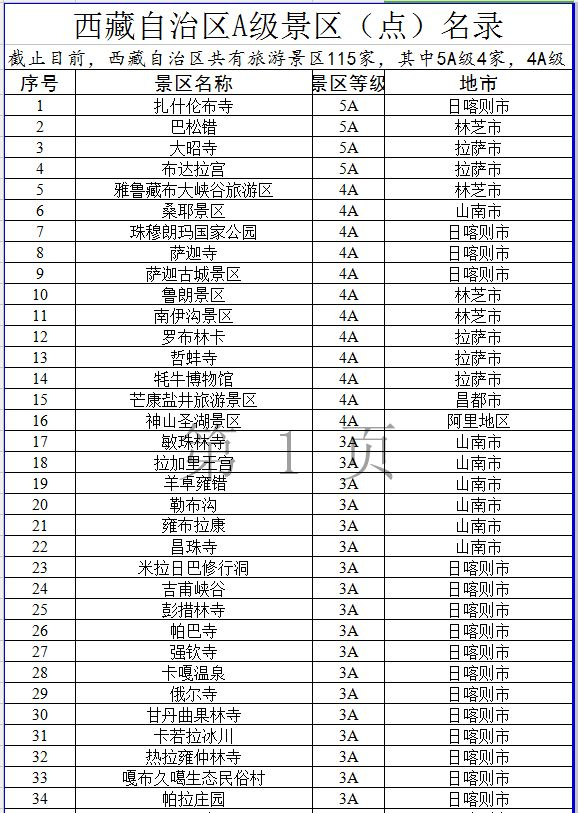 (截止目前,西藏自治区共有旅游景区115家,其中5A级4家,4A级12家,3A级45家,2A级38家,1A级16家)
