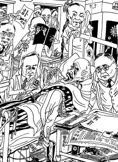 1948年,漫画大家张文元作《大闹宁国府》,“宁”为南京简称,该画讽刺南京政府混乱不堪,行将崩溃