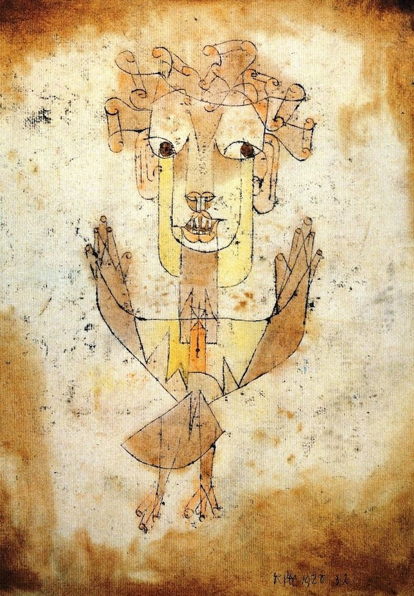 保罗·克利的《新天使》画的是一位天使,看上去正要从他入神地注视的事物旁离去。他凝视着前方,他的嘴微张,他的翅膀展开了。人们就是这样描绘历史天使的。他的脸朝着过去。在我们认为是一连串事件发生的地方,他看到的则是一场单一的灾难。这场灾难堆积着尸骸,将它们抛弃在他的面前。天使想停下来唤醒死者,把破碎的世界修补完整。可是,从天堂吹来了一阵风暴,它猛烈地吹击着天使的翅膀,以至他再也无法把翅膀收拢。这风暴无可抗拒地把天使刮向他背对着的未来,而他面前的残垣断壁却越堆越高,直逼天际。这场风暴就是我们所称的进步。——本雅明