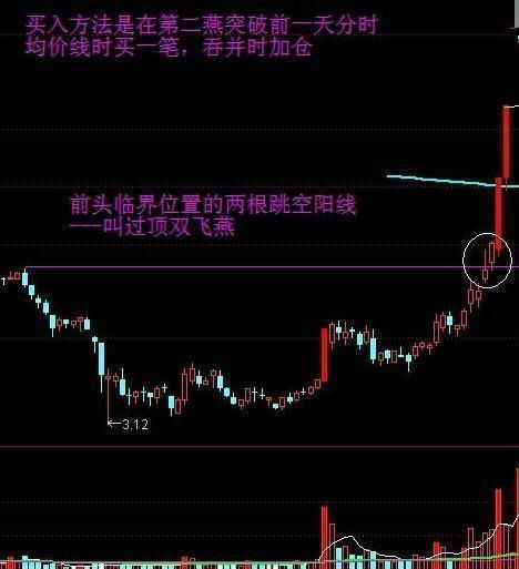 (1)是指一浪顶的临界突破位置,先有一阳中、大阳线,然后两根小阳线。两根跳空阳线,只有一根阳线的,叫单飞燕