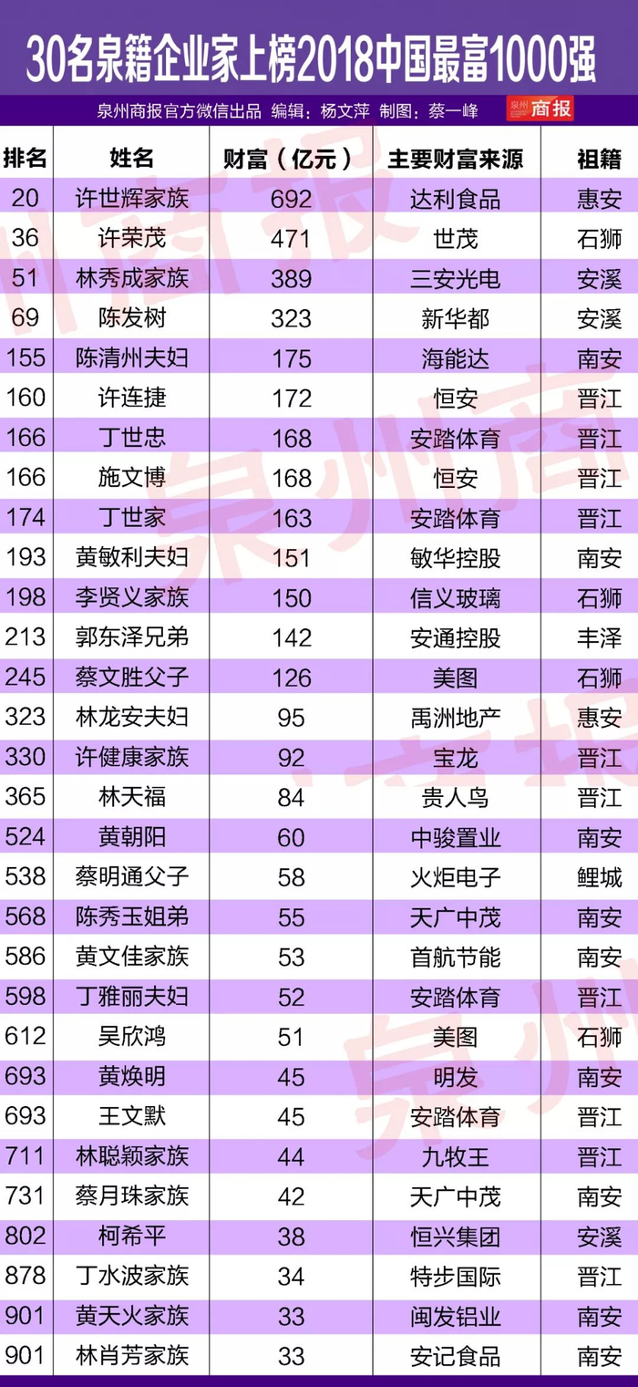 1月29日,界面新闻重磅推出“2018中国最富1000人”榜单。1000位上榜富豪(富豪家族)的总财富达到惊人的12.5万亿元(人民币,下同),上榜门槛30亿元。有30位泉商(含泉籍)上榜,达利许世辉再次坐拥泉州榜首位置;有4名泉商排在前100强,分别是:许世辉家族、许荣茂、林秀成家族、陈发树。