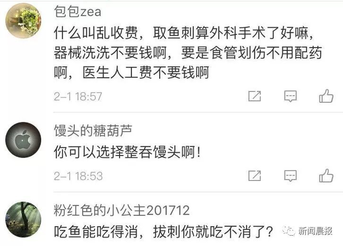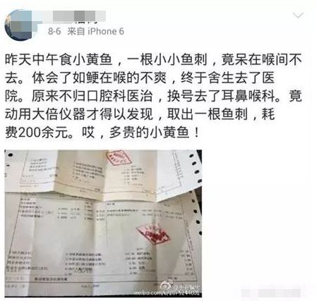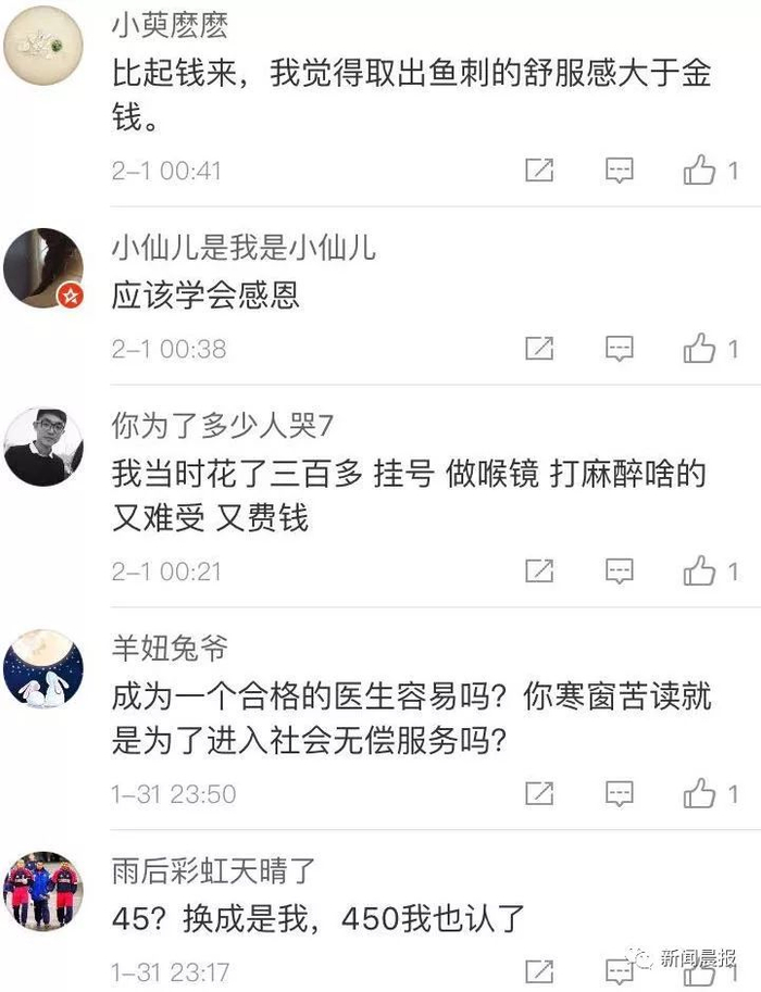 近日,浙江省杭州一姑娘在微博上发文称,“今天中午跟朋友去吃烤鱼,结果不小心鱼刺卡喉,下午就去了萧山三院取鱼刺。就1分钟的时间,医生就取出一根1厘米左右的鱼刺。原以为拿个鱼刺最多也就10块钱吧,付款时居然收了35块!再算上挂号的10块钱,我也只是个学生,这么乱扣起来吃不消啊…”