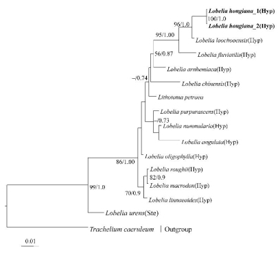 图2.基于atpB、rbcL和ITS构建的半边莲属部分类群的系统进化树