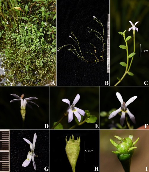 近期,中国科学院武汉植物园考察人员在广西临桂县的一次水生植物类群采样过程中,发现一种花冠结构特殊的半边莲属植物,并在邻近区域又发现了该半边莲的另一居群。在压制足够的标本,考察人员又将部分活体植株栽培于武汉植物园温室,留待后续观察实验。在研究员王青锋、胡光万的指导下,博士研究生李治中、魏能对该类群开展系统分类学研究。该半边莲属植物的形态特征明显区别于其他物种,运用叶绿体基因和核基因分子标记(atpB、rbcL和ITS),构建的该半边莲属植物与近缘类群的系统发育关系,也能明显将其区分开来。基于此,研究人员确定其为半边莲属中从未记载过的新类群,以“hongiana”作为该新种的种加词,中文译名为“洪氏半边莲”,以纪念中科院院士、植物学家洪德元对桔梗科分类学研究的突出贡献。