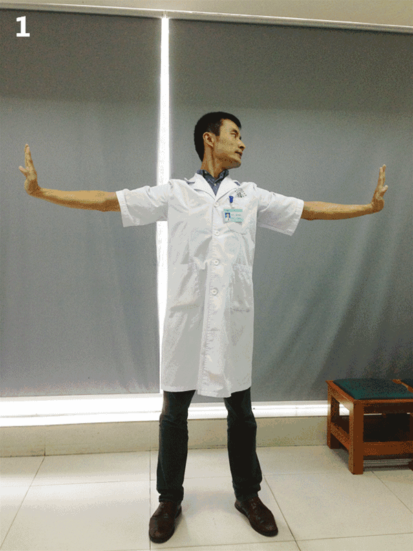 ④头部向左旋转目视左手尖8-10秒,头部回到中立位。