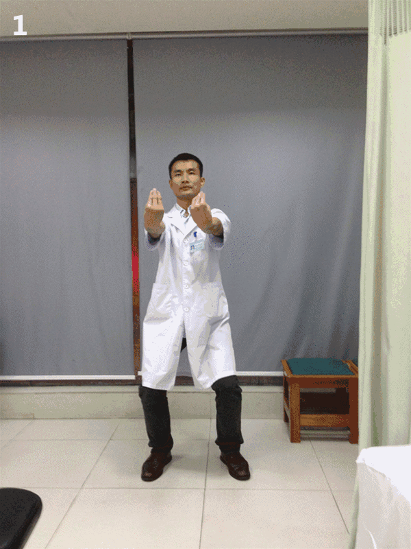 ①自然站立两手自然下垂,双臂外旋掌心朝前,左弓步,同时双手前伸。