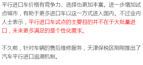 业内人士介绍,平行进口车与一般进口车,在关税上其实都执行统一标准,但由于目前平行进口汽车可以享受3个月的保税周期,经销商无需在车辆进口后马上完税,可以极大降低资金积压带来的金融成本。