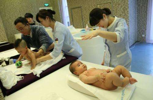 ↑资料图片:1月30日,母婴家庭保健师在上海一家月子会所内护理婴儿。记者 裴鑫\摄