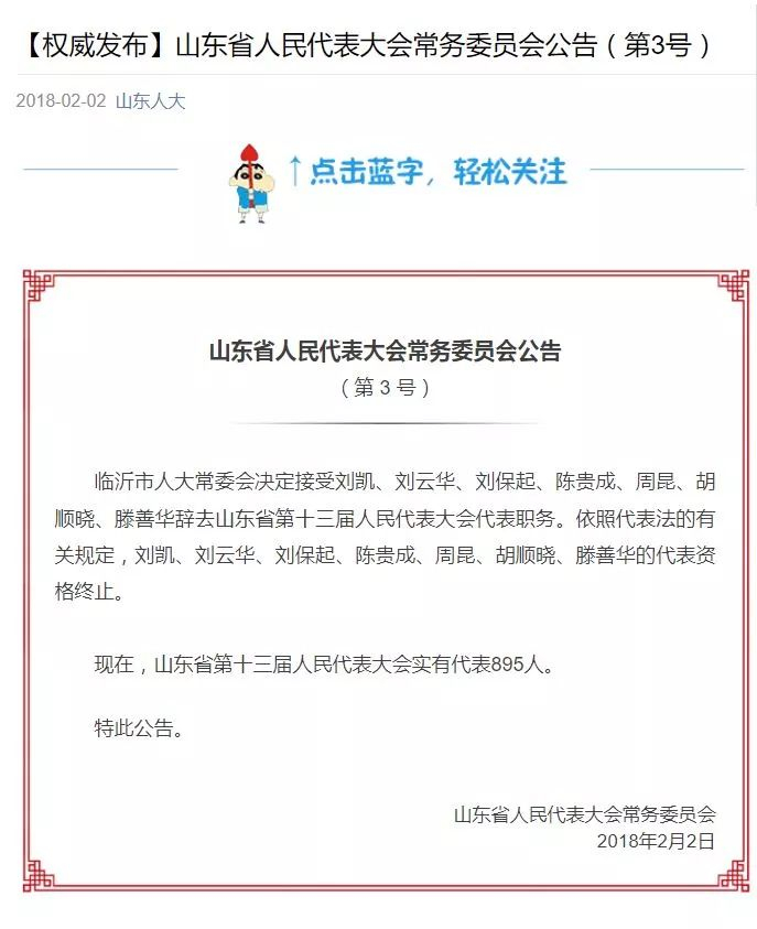 据山东省人大常委会办公厅官方微信于2月2日下午发布的山东省人民代表大会常务委员会公告(第3号),临沂市人大常委会决定接受刘凯、刘云华、刘保起、陈贵成、周昆、胡顺晓、滕善华辞去山东省第十三届人民代表大会代表职务。依照代表法的有关规定,刘凯、刘云华、刘保起、陈贵成、周昆、胡顺晓、滕善华的代表资格终止。该公告同时称,山东省第十三届人民代表大会实有代表895人。