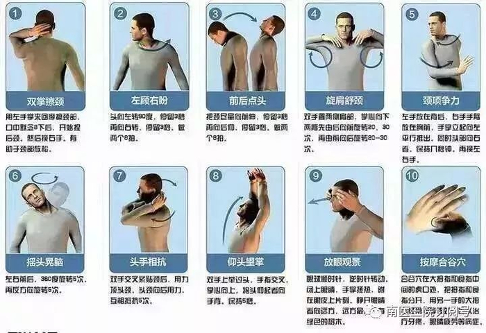 1.双掌擦颈。用左手掌来回摩擦颈部,口中默念8下后,开始捏后颈,然后换右手,这种方法有助于颈部放松。