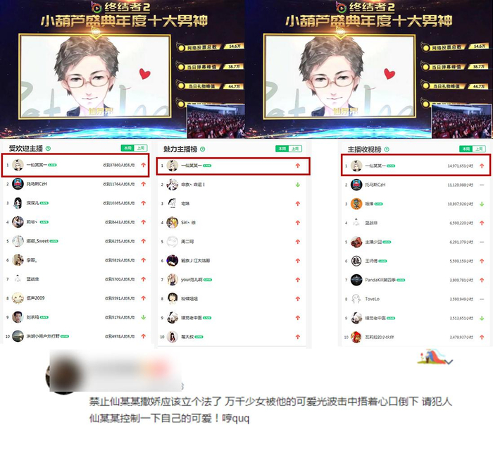 近期,他更是获得了小葫芦盛典年度十大男神和十佳新晋游戏主播的称号。除此之外,在熊猫TV的魅力主播榜、主播收视榜、受欢迎直播榜单中,仙某某长期盘旋在第一的位置,足以看出观众们对他的喜爱。更有粉丝直言“中了仙某某的毒,简直太可爱了,苏到原地爆炸”,可见仙某某的人气之高,在玩家心目中的形象非同凡响。