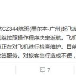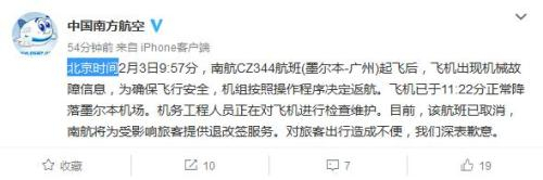 南方航空CZ344墨尔本飞往广州航班因故返航 中国新闻网 2018.02.0313:53 关注 中国南方航空官方微博截图中新网2月3日电 据中国南方航空官方微博消息,北京时间2月3日9:57分,南航CZ344航班(墨尔本-广州)起飞后,飞机出现机械故障信息,为确保飞行安全,机组按照操作程序决定返航。飞机已于11:22分正常降落墨尔本机场。机务工程人员正在对飞机进行检查维护。南航称,目前,该航班已取消,南航将为受影响旅客提供退改签服务。对旅客出行造成的不便深表歉意。
