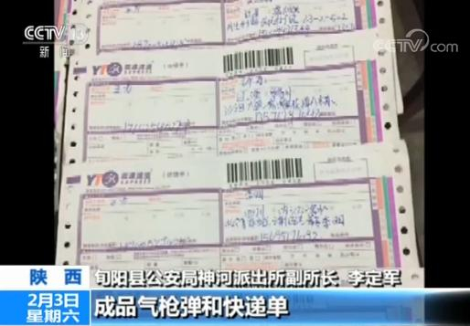 旬阳县公安局神河派出所副所长 李定军:将前往快递公司给下线发货的徐某现场抓获。从徐某的身上缴获了大量的成品气枪弹和快递单。