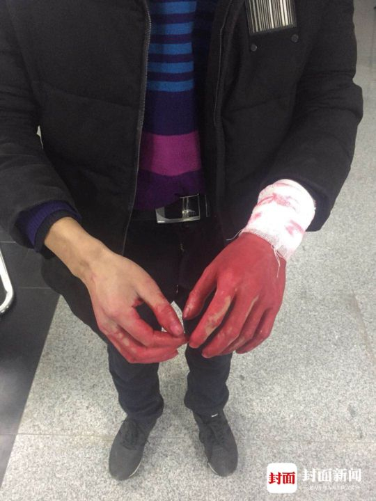 此时男子的左手通红,染红了衣袖
