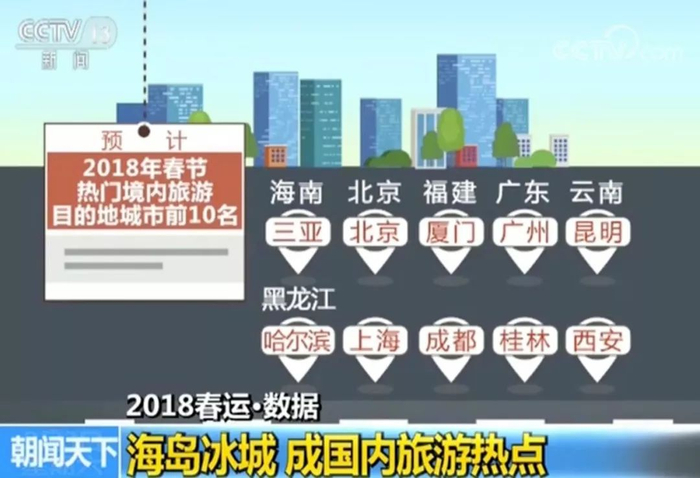 结合旅游交通数据,南方海岛、北方冰城成为国内旅游热点。预计2018年春节热门境内旅游目的地城市前10名依次是:三亚、北京、厦门、广州、昆明、哈尔滨、上海、成都、桂林、西安。从省份看,海南、北京、黑龙江、云南、福建、广东等排名领先。