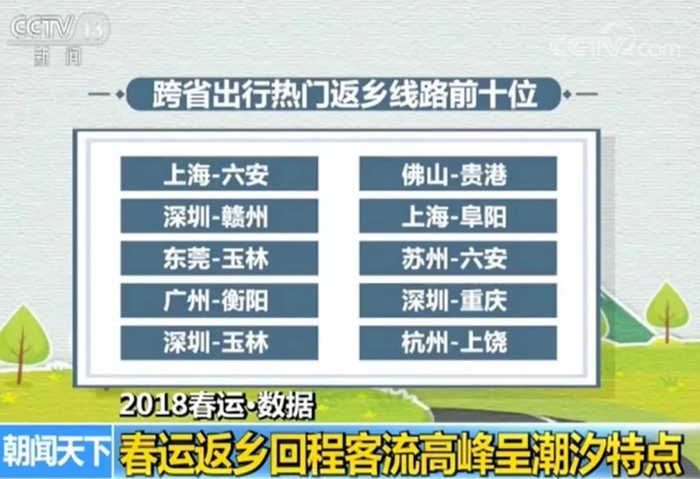 节前返乡热点出行线路主要以特大城市为中心向周边扩散,跨省出行热门返乡线路前十位分别为:上海-六安、深圳-赣州、东莞-玉林、广州-衡阳、深圳-玉林、佛山-贵港、上海-阜阳、苏州-六安、深圳-重庆、杭州-上饶。