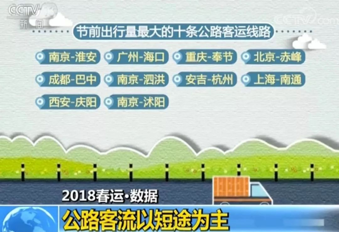公路方面,客流以短途为主。节前出行量最大的十条公路客运线路为:南京-淮安、广州-海口、重庆-奉节、北京-赤峰、成都-巴中、南京-泗洪、安吉-杭州、上海-南通、西安-庆阳、南京-沭阳,以省内或往邻省的短途出行线路为主。热点公路客运站对城市交通接驳集散服务需求较为突出。