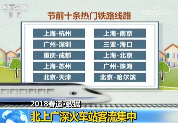 根据火车票预售数据,节前十条热门铁路线路为:上海-杭州、广州-深圳、重庆-成都、上海-苏州、北京-天津、上海-南京、三亚-海口、上海-北京、广州-珠海、北京-哈尔滨。这些热门线路中,高铁出行需求快速增长。
