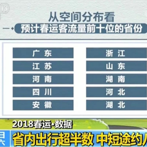 数据显示,从春运出行范围看,省内出行量预计占总量的57%,高于跨省出行量。从空间分布看,预计春运客流量前十位的省份有广东、江苏、河南、四川、安徽、浙江、山东、湖南、河北、湖北。