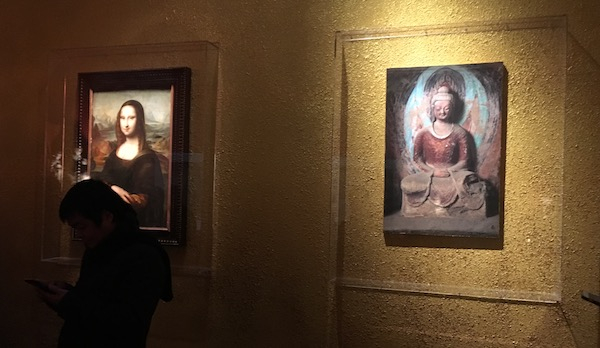 展览入口处,两尊近三米高的泥塑菩萨立像以迎宾之势邀请观众进入造像深处的世界,它们分别为麦积山第4窟5龛、6龛的宋代泥塑菩萨立像。《趺坐禅定佛》(敦煌莫高窟第259窟,北魏,孙志军摄影)被誉为“东方的微笑”,其神秘的微笑给人无限遐想。与其并置的,是刚刚落幕的“奇迹:贝利尼家族与文复兴特展”中创作于十六世纪的《蒙娜丽莎》(意大利,16世纪,达·芬奇的佚名追随者,布面油画),恍若铸就了一场跨越千年的东西方对笑。
