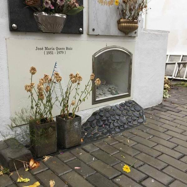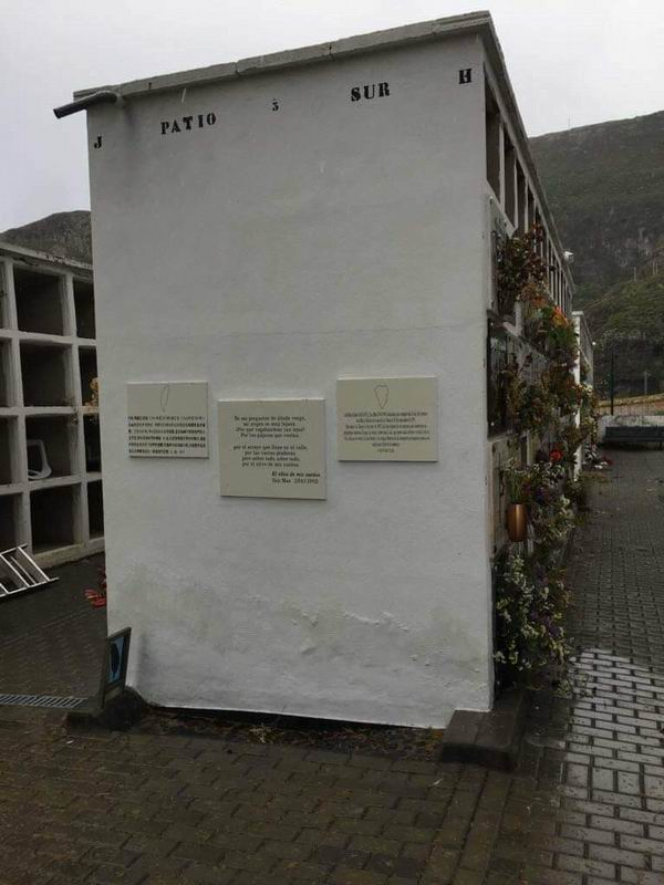 这座荷西与Echo的合葬墓座落在一道壁葬墙里,下方有一个玻璃龛,据说是一位匿名的华人捐置的;龛里放置着两人的照片,照片前有许多写了字的纸条和小石头,上面的字西文中文都有。想要致意的人,可以请管理员打开锁住的龛门,放进自己的留言。壁葬墙侧面一堵空白的墙上,有三块献给他俩的小石碑,右边一块有七行西班牙文字,左边那块是中文翻译,恐怕是用翻译机转换过来的,因而不是很通顺,尤其最后两句实在不知所云,但整体的意思还是明白的: