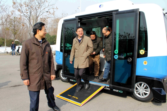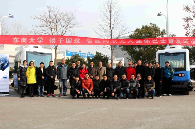 2月2日上午,东南大学联合南京扬子国资投资集团有限责任公司在东南大学九龙湖校区举行合作运营的国内首辆智能网联无人迷你巴士的首发试运行,东南大学副校长吴刚,扬子国投集团董事长蔡龙,学校相关部门负责人以及巴士运营团队全体成员参加了首发试运行活动。