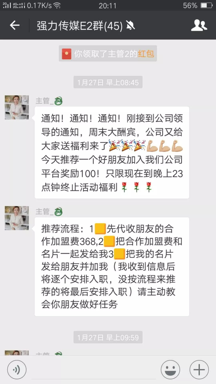 “这个群主打着‘香港强力传媒有限公司’的名义,发一些广告,反正给大家的感觉就是这个公司很有实力,因为收取的钱并不多,而且还是亲戚推荐,我就参与进来了。”赵女士说,在缴纳保证金后,她被拽到了一个名为“强力传媒”的微信群内,当时群里有32个成员。
