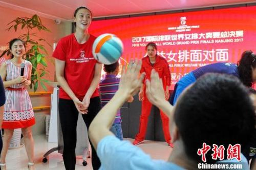 资料图:惠若琪与孩子们打起室内排球。 李珂 摄